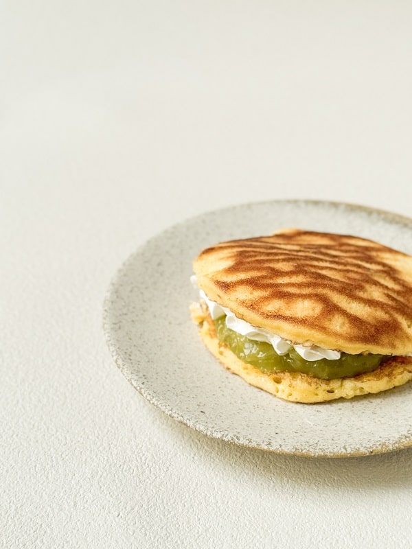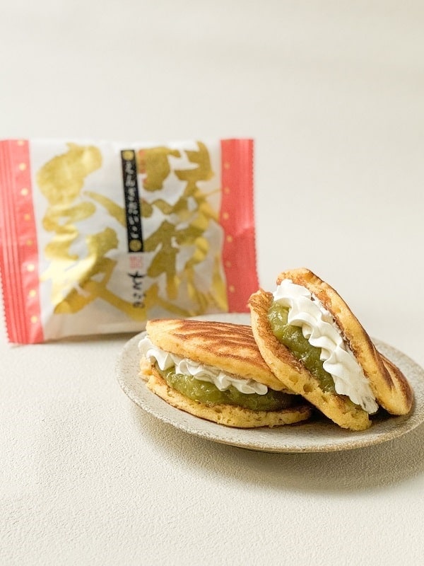 当店1番人気の和菓子「縁起太鼓」虎柄の皮にバタークリームとうぐいす餡を挟んだ洋風などら焼き。ほのかに感じるラム酒の香りが香ばしい皮とよく合います。名前に縁起という言葉がついていることもあり、贈り物に大人気の一品です。