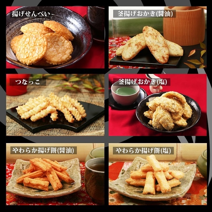 | 商品内容 | 揚げ餅(醤油)1袋、揚げ餅(塩)1袋、釜揚げおかき(醤油)1袋、釜揚げおかき(塩)1袋、揚げせん1袋、つなっこ1袋 |