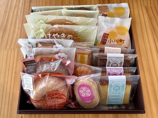 焼ドーナツ(プレーン)、焼ドーナツ(チョコレート)、ダックワーズ、フィナンシェ、シェルマドレーヌ、フロランタン、小川町マドレーヌ、小川町マドレーヌ(黒糖)、オレンジケーキ、ケイクショコラ、フルーツケーキ、トリヨンフ、カタクリの里ラスク×2、けやきのリーフパイ×2、クッキー(2枚入)×5種類の計21個の焼菓子詰め合わせです。表面に砂糖をまぶしてふっくらと仕上げた「焼ドーナツ」や、地元の地名が入った「小川町マドレーヌ」、小川町の木である欅をモチーフにした「けやきのリーフパイ」など、人気の焼菓子を種類豊富にお楽しみいただけるよう詰め合わせました。お土産にもぴったりな商品です。